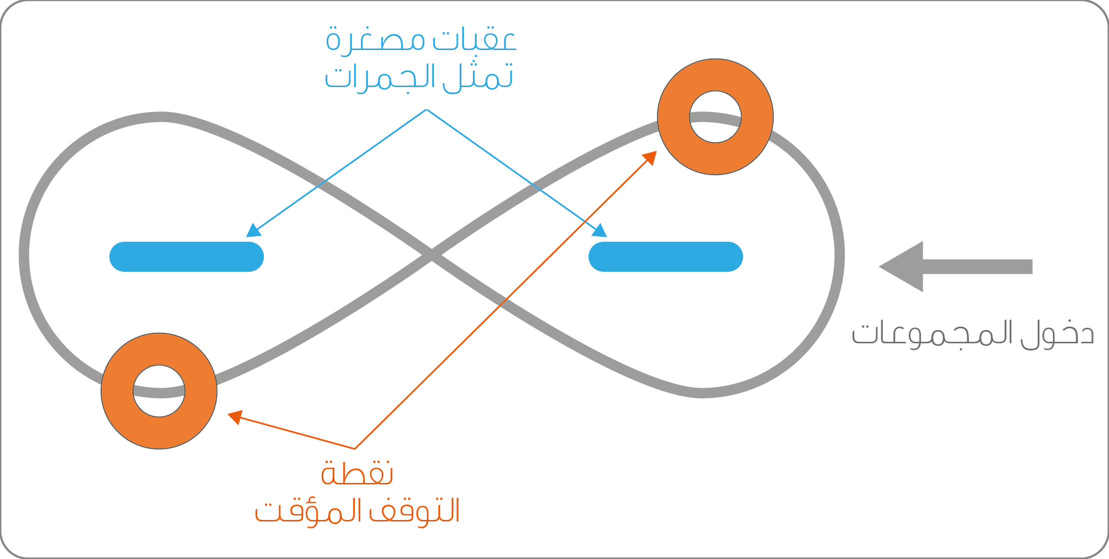 الحركة في الجمرات هي حالة خاصة متعاقبة ثلاث مرات من المشي والتوقف لأداء مناسك الرمي، حيث تسير الأفواج متجهة نحو الجمرة الأولى وتقف عندها للرمي والدعاء ثم تتجه نحو الثانية وترمي وتدعو كذلك وبعدها الثالثة لتعيد ما سبق، ويمكن اختصار سيناريو الرمي إلى حالة مشي وتوقف مؤقت، غير أن السنة في هذا النسك تستدعي قلب الاتجاهات بين الجمرات، ولذا فإن السيناريو يشمل الذهاب إلى الجمرة الأولى والوقوف المؤقت ثم التوجه إلى الجهة المقابلة عند الجمرة الثانية والتوقف المؤقت وهكذا، وهذا التوقف المؤقت يتم تصغيره في هذا السيناريو ليقارب 30 ثانية، ويكون تدفق دخول المجموعات على دفعات دون خروج لملاحظة أثر الازدحام على التدفق داخل الجمرات، ومع التكرار تشكل الحركة داخل السيناريو شكل رمز اللانهائية مع وجود نقطتي توقف متناظرتين